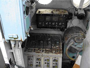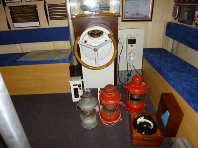 In einer anderen Ecke des ehemaligen 9-Mann-PUO-Decks befinden sich Ausbauteile von S-"Kranich" - der Ruderstand Brücke, ein Hilfsmaschinentelegraf uind ein Bordtelefon sowie Fahrtstörungslampen, ein Varta-Scheinwerfer und die Stb- und Bb-Positionslaternen.