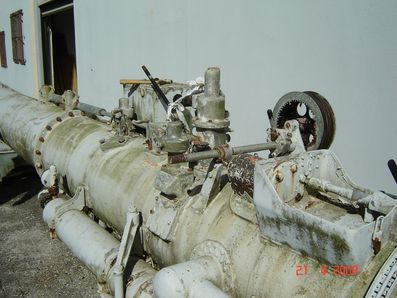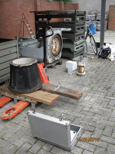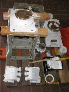 Stb-Aussen-Propeller von S-"Kranich" Artilleriezielsäule OGR-7 Rohrzielapparat RZA 5B Steuerstand Brücke Einige Kleinteile, für die der Verwerter keine Verwendung hat, wurden bereits mitgebracht (z.B. das RZA 5b, ein BÜ-Set, der Ruderstand Brücke und ein Notmaschinentelegraf). Die Teile, die die Verwertungsfirma für uns ausbauen, lagern und nach Wilhelmshaven schicken soll, wurden mit blauer Kreide gekennzeichnet. Einzelheiten über die Überlassung und den Transport des Propellers, des Torpedorohrs und der beiden Zielsäulen sollten noch vereinbart werden. Es ergab sich allerdings, dass der Propeller im Vorgarten des Verwerters aufgestellt wurde und wir OGR 7, Torpedozielsäule und Torpedorohr IV für den Aluminiumpreis bekamen und selbst abholen mussten.