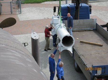 Am 19.05.2008 erteilte der Förderverein den Auftrag an Firma Lenz-Kran aus Bremerhaven, die Teile (Torpedorohr, OGR 7 und Torp.-Zielsäule) aus Dänemark auf einer Leerfahrt von Hirtshals mitzubringen. Orla Rasmussen hatte die Teile ausbauen lassen und bei sich in Bjerringbro für uns gelagert. Dort wurden sie am 20.05.2008 aufgeladen, nachdem das Torpedorohr in zwei Teile auseinander genommen worden war. Am 21.05.2008 war es denn soweit, die zukünftigen Exponate wurden in Wilhelmshaven abgeladen. Sie wurden in einer Halle und warteten auf ihre Überholung durch den FMS. Das Torpedorohr wurde in wochenlanger Arbeit in einen museumswürdigen Zu9stand versetzt, ebenso die Torpedozielsäule. Das RZA 5B wurde von Klaus Heidemann zu Hause überholt genau wie die Artilleriezielsäule bei Bernd Etzold in Bad Berleburg.