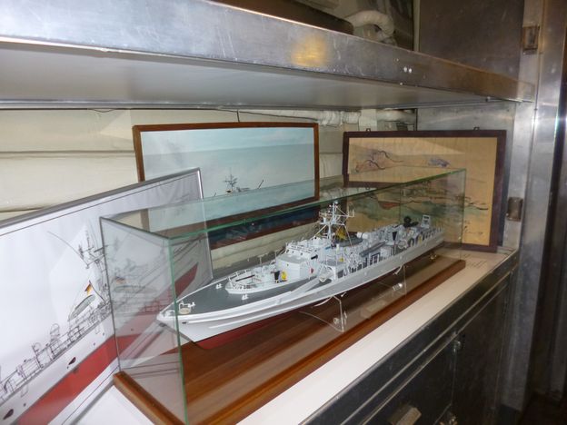Übergabe des Modells an den Musuemsleiter - Foto: Archiv FV Da die Geschütze des "Kranich" schon sehr gelitten haben, das DMM bereits über zwei Bofors 40-mm Geschütze verfügt, der Platz im Außenbereich knapp wird und der Transport teuer würde, wurde auf die Beschaffung eines weiteren Geschützes verzichtet. 40mm-Kanone Bofors/L 70 MEL, Foto: Archiv FV Die Dauerausstellung im Vorschiff der "Mölders" umfasst auch ein Modell des "Kranich" im Maßstab 1:40. Es wurde von Hans-Hinrich Jürgens aus Sehnde gebaut.