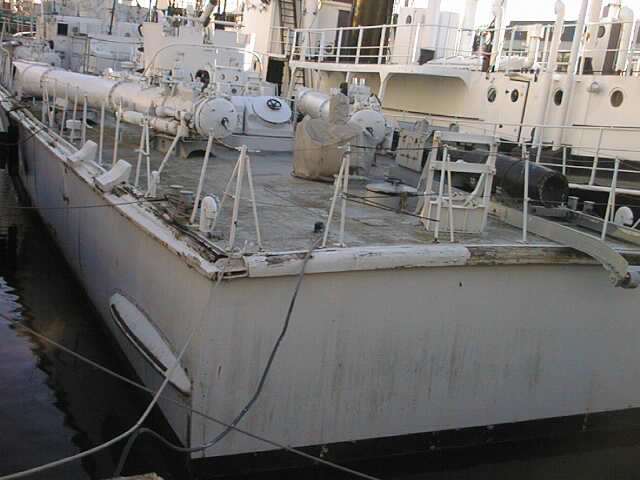 Sachstand 21.12.2004 Auch das "Aus-der-Sicht-Nehmen" des "Kranich" kann nicht mehr darüber hinweg täuschen, dass das Boot kurz vor seinem Ende steht, wenn nicht sofort etwas geschieht. Nachdem zuerst das Seitendeck aufquoll und Risse bekam, durch die Regenwasser in das Boot eindringen konnte, folgten Risse im Decksbereich vor der Brücke. Seit 2001 verabschiedete sich die Farbe großflächig von der Back und vom Hauptdeck. Jetzt ist nicht nur der Mast abgeknickt sondern das Achterdeck löst sich von den Decksstringern. Durch das Umpacken des "Päckchens", so dass "Kranich" zwischen "Rau IX" und "Seefalke" liegt, sind die Bereiche Back und Mitteldeck durch den zufälligen Betrachter nicht mehr so gut zu sehen. Aber es muss einfach jedem Betrachter allein des Hecks auffallen, dass hier mit einem einst wertvollen Fahrzeug der Marine Schindluder getrieben worden ist, den eigentlich ein Museum, das sich stolz Deutsches Schifffahrtsmuseum nennt, in dieser Form nicht verantworten kann. Wer glaubt, dass ein neues Boot vom Typ 143 nicht in wenigen Jahren genau so aussieht wie der "Kranich"? Dieser augenscheinliche Verfall eines Bootes der Marine, auf dem hunderte von jungen Männern im Dienst der Bundesrepublik Deutschland zur See gefahren sind, kann doch niemand kalt lassen.. Hoffentlich bleibt ein solches Schicksal anderen außer Dienst gestellten Booten der Marine erspart. |