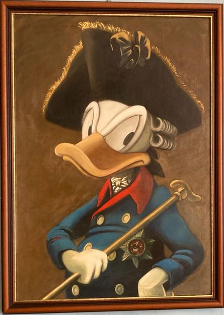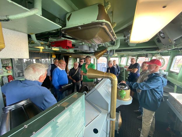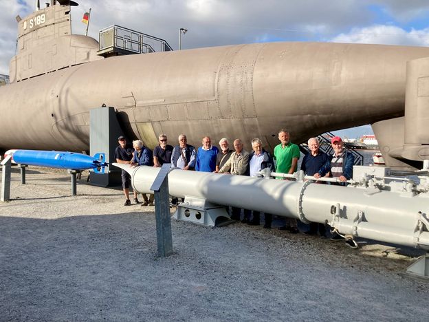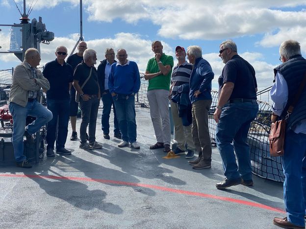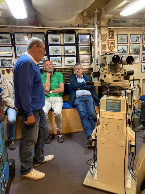Von Links: Ralf Bannier, Wolfhard Laszig, Klaus Jentoch, Veit Nejedlo, Kalle Scheuch, Wolfgang Hammer, Achim Zarske, Heinz Singer, Berd Jung, Manfred Schultheis, Hans-Joachim -Bork - Foto: Boris Laszig Am 26.08.2022 trafen die Teilnehmer am Treffen in Jever ein. Kalle hatte Unterkünfte im Hotel Pellmühle organisiert. Ralf wohnte im Hotel zum Schützenhof und Bernd bei Kalle und Janka. Veit reiste aus gesundheitlichen Gründen erst für die Programmpunkte am Sonnabend, dem 27.08.2022, an und fuhr anschließend wieder nach Hause. Wolfhard hatte seinen Sohn Boris mitgebracht, der am 27.08. Mitglied des Vereins wurde. Am Abend des 26.08. trafen sich die Teilnehmer und fünf Ehefrauen zum gemeinsamen Essen im Restaurant des Stadthotels Jever. Anschließend wurde in der Pellmühle noch längere Zeit getagt. Am 27.08. besuchte die größte Anzahl der Teilnehmer das Schloss zu Jever, um die Sonderausstellung Duckomenta zu besuchen. Alle waren begeistert von der ausgestellten Kunst und vom Jeverschen Schloss allgemein. Der Große Fritz in der Duckomenta - Foto: Wolfgang Hammer Nach einem Treffen bei Janka und Kalle teilte sich die Gruppe auf. Die Damen unternahmen mit Janka ein Damenprogramm mit Besuch an der Küste und im Horster Grashaus. Die Herren besuchten das Deutsche Marinemuseum in Wilhelmshaven. Kalle führte die Männer-Gruppe zunächst über das Museumsboot "S71 Gepard" und in die Vereinsbereiche auf dem Boot.