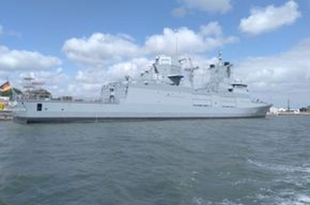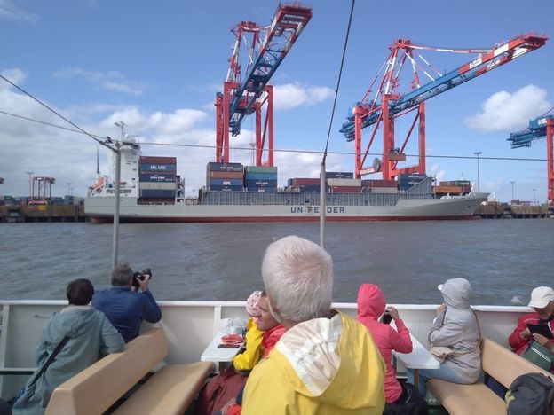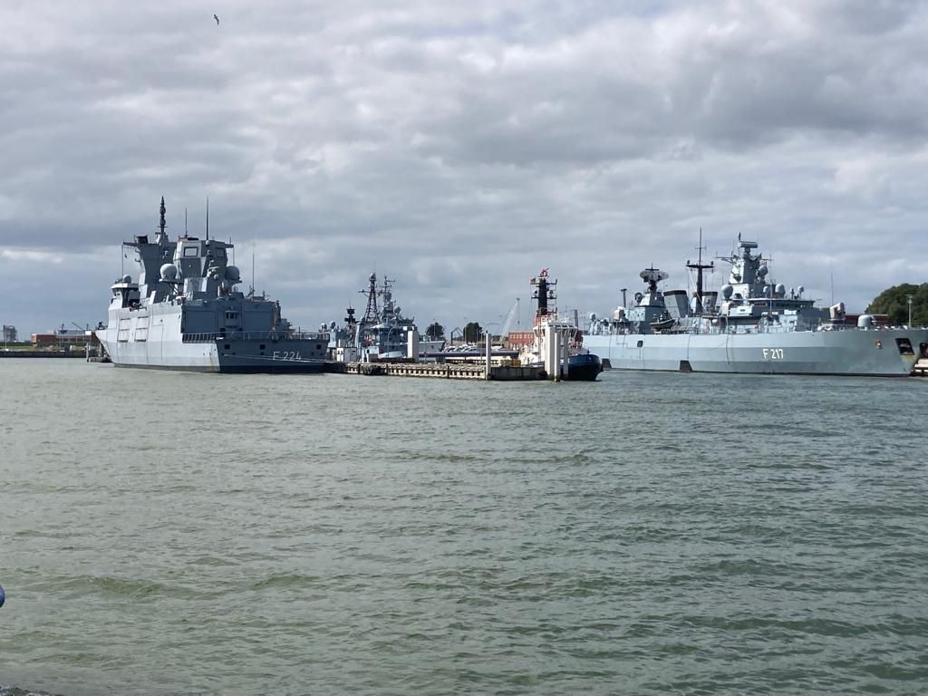 Die versammelten "Kranich"-Fahrer - Foto: Boris Laszig Von Links: Hans-Joachim Bork, Manfred Schultheis, Klaus Jentoch, Kalle Sscheuch, Achim Zarske, Wolfhard Laszig, Heinz Singer, Ralf Bannier, Veit Nejedlo, Wolfgang Hammen und Bernd Jung Kleine Pause in Abt. III des "Gepard" - Foto: Boris Laszig Anschließend fand eine fachkundige Führung über die "Mölders" durch Kalle statt, der 1972 bis 1974 auf dem Schwesterschiff "Lütjens" gedient hatte. Besonders waren die Teilnehmer von den Sammlungen und Modellen im Vorschiff der "Mölders" beeindruckt. Kalle erläutert die Antenne auf dem Mast der "Mölders" - Foto: Boris Laszig Auf der Brücke der "Mölders" - Foto: Boris Laszig Kalle erläutert die Geschichte unserer Sammlungen - Foto: Boris Laszig Am Abend trafen sich dann wieder alle Teilnehmerinnen und Teilnehmer zum gemeinsamen Essen im Restaurant "Athen's" in Jever. Natürlich wurde hinterher wieder ausführlich getagt. "Und die See ging hoch und der Sturm wehte ..." Leider musste eine ganze Reihe Personen am Sonntag gleich nach dem Frühstück abreisen. Die verbliebenen acht Personen machten dann eine Große Hafenrundfahrt mit der MS "Harle Kurier" zum Jade-Weser Port, an den Ölpiers vorbei in die 4. Einfahrt wo jede Menge Fregatten der Klassen 123, 124 und 125 sowie zwei Einsatzgruppenversorger bestaunt werden konnten. Feeder-Schiff am Jade-Weser-Port - Foto: Ralf Bannier Fregatte Baden-Württemberg F 222 (Klasse F 125) - Foto: Ralf Bannier Fregatte Sachsen-Anhalt F 224 (Klasse 125) und Fregatte Bayern F 217 (Klasse F 123) - Foto: Wolfgang Hammer Anschließend nahm man dann noch ein gemeinsames Mahl im Restaurant CaOs in Wilhelmslhaven ein, ehe alle Richtung Heimat aufbrachen. Das Treffen war ein voller Erfolg. Alle lobten die Organisation und das gute Wetter, das einen guten Anteil am Gelingen hatte.